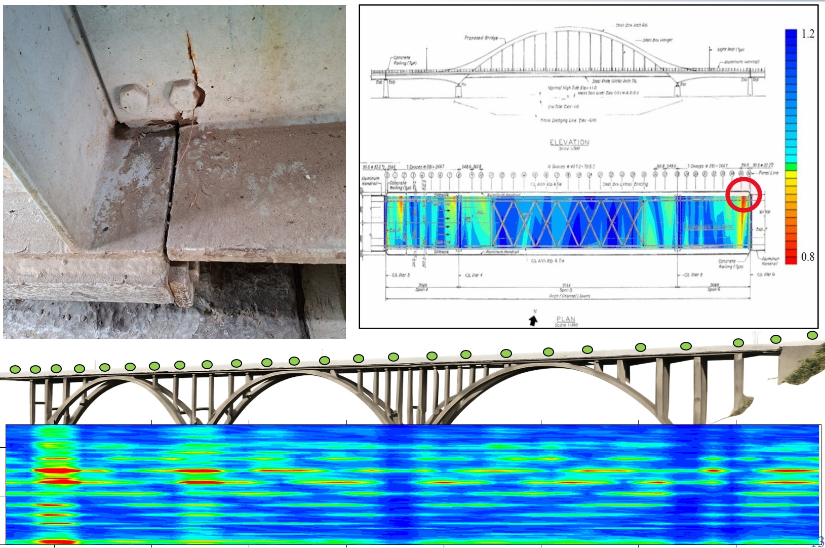 Многоточечный анализ модальных форм вдоль пролёта и по опорам позволяет выявлять зоны повышенных напряжений и концентрации деформаций — участки, где динамические отклики достигают максимума и риск повреждений выше. Локальные изменения частот и форм служат индикатором скрытых дефектов: потери предварительного натяжения, трещин в балках и плитах, ослабления опорных частей, повреждений подвесок и вант. В итоге заказчик получает не только набор «резонансных частот», но и практические выводы: есть ли признаки структурных аномалий, каков реальный запас жёсткости и остаточного ресурса, и требуется ли ограничение нагрузок, усиление или организация постоянного мониторинга с автоматической диагностикой.