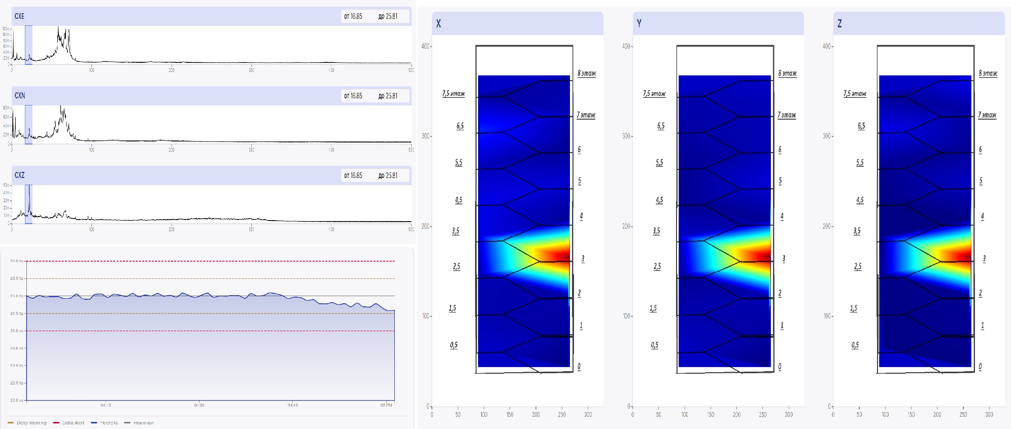 Дополнительно анализ модальных форм и частот позволяет выявить наличие зон повышённых напряжений и потенциально опасных участков – этажи или фрагменты, где колебания концентрируются и могут приводить к ускоренному износу. При многоточечных измерениях фиксируются признаки скрытых дефектов: локальное снижение жёсткости, расслоение, потеря совместной работы элементов. В результате заказчик получает не только цифру «собственной частоты», но и наглядные выводы: есть ли структурные аномалии, насколько здание близко к порогу вмешательства, и какие меры (наблюдение, усиление, ограничение режимов эксплуатации) целесообразно планировать.